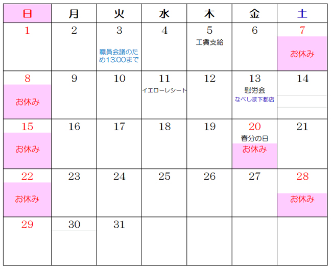 3日は、職員会議のため、営業は13時までとさせていただきます。よろしくお願い申し上げます。