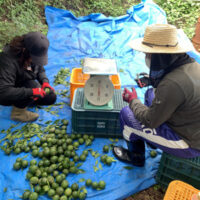 カボスの収穫作業を行っています。 1つづつ慎重に拾い、ヘタの部分をハサミで切ります。 暑い中での作業ですが、優しい農家さんの協力を得ながら頑張っています。