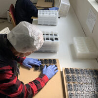 カメラ部品の治具付けや不要な部分をカットしたり、専用道具で押す作業をしています。
